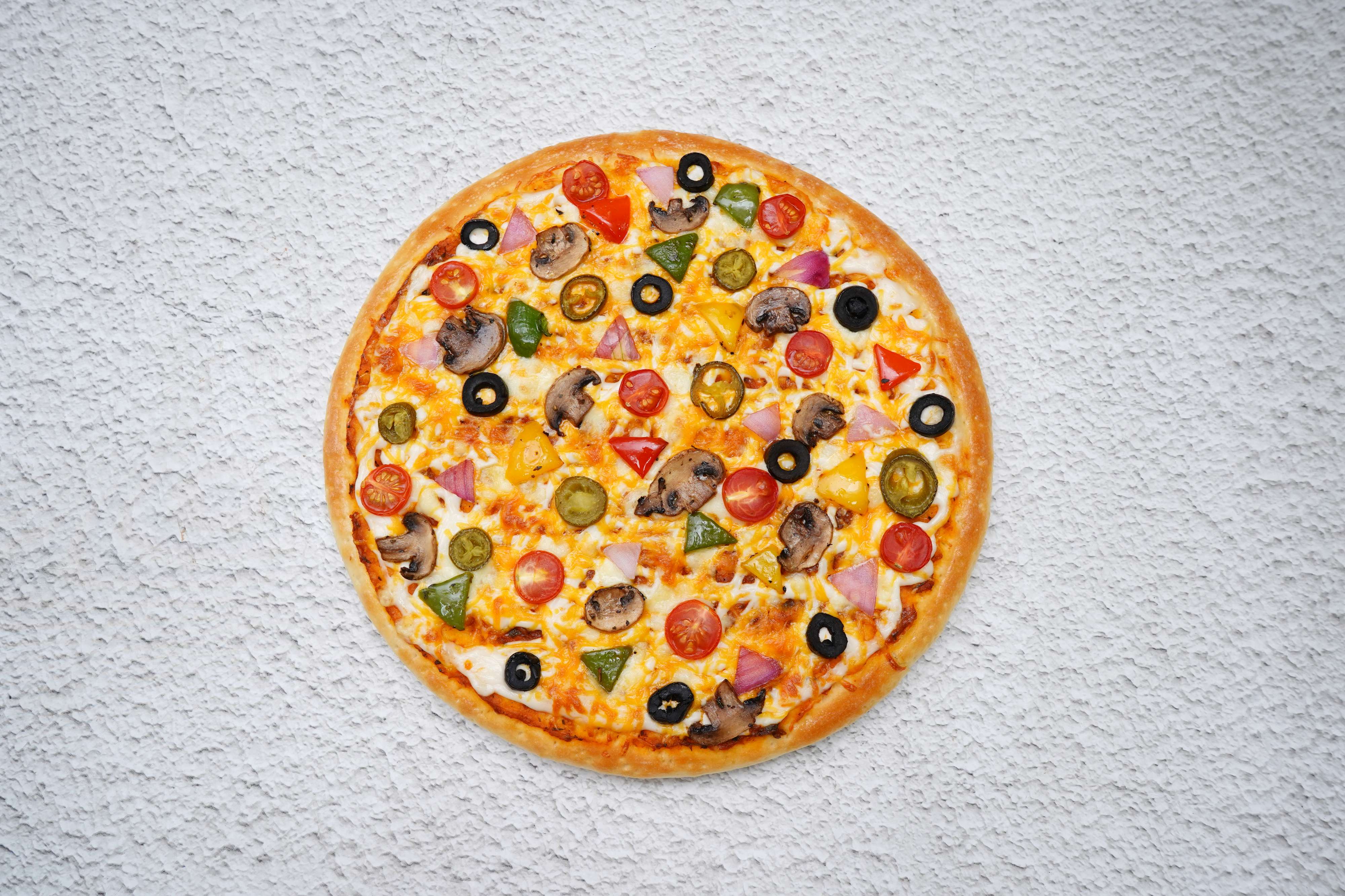 Pizza Sauce, Corn, Onion, Roasted Bell Peppers, Cherry Tomato, jalapeno, Olives, Mushroom, Mozzarella, Cheddar