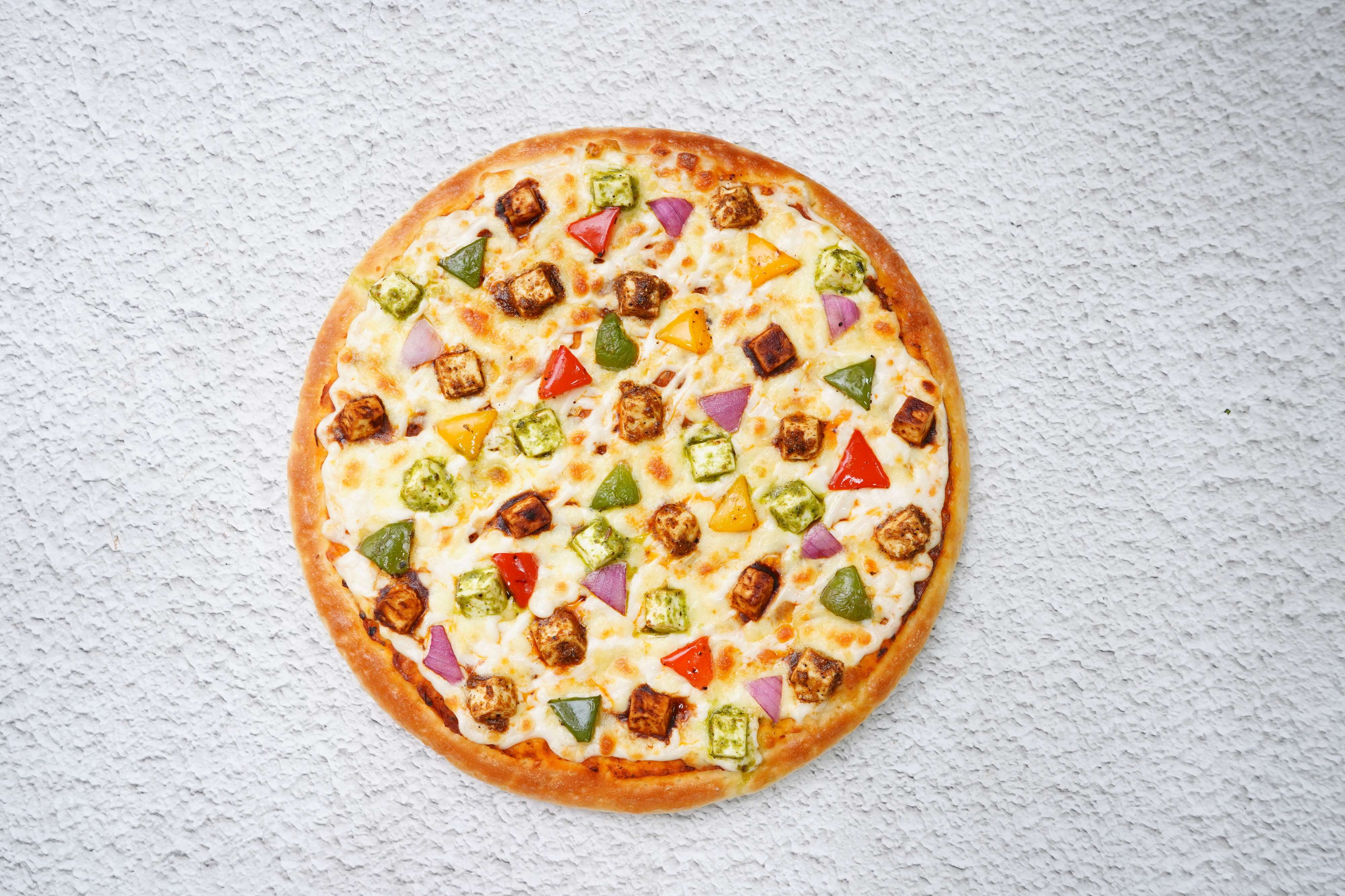 Pizza Sauce, BBQ Paneer, Pesto Paneer, Spicy Paneer, Onion, Bell Peppers, Mozzarella